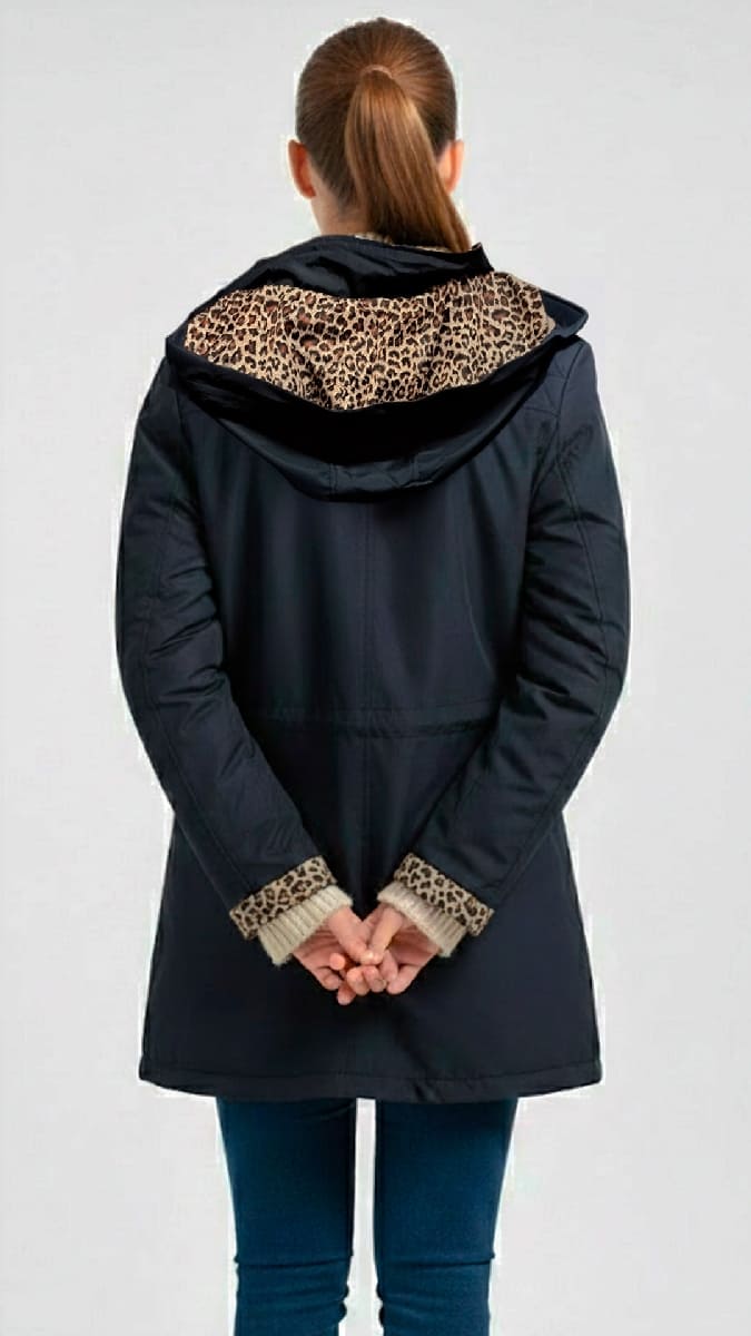 Descubre la Chaqueta Estructurada Mujer Aris. Diseño exterior minimalista con un exclusivo interior de leopardo. Calidad premium, no se arruga y es pura tendencia urbana.
