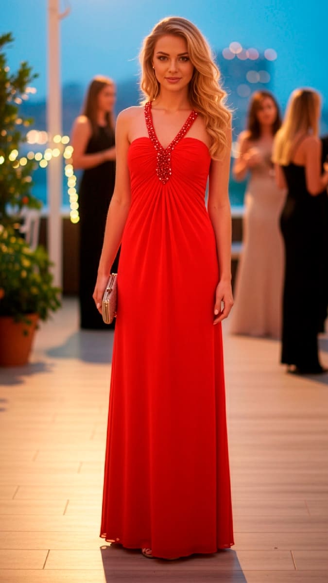 MAGIA | Vestido de Gasa Rojo Halter | Cuentas | Fiesta Formal